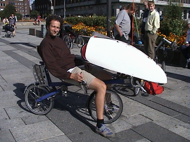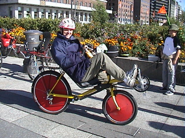 Carl Etnier Video(4,6 MB) Image | Current recumbent bicycle: Red 1999 Rans Rocket. Previous recumbents: 1996 Bjällby Easy (short wheelbase, under the seat steering) frame that I built up myself, 1998 BikeE AT Current folder: Super Brompton, a Brompton tricked out with 24 gears, hydraulic brakes, and many weight-reducing finesses by Len Rubin I also chauffeur a recumbent, four-wheeled pedicab in Oslo , and have a number of uprights in my stable for occasional use. |