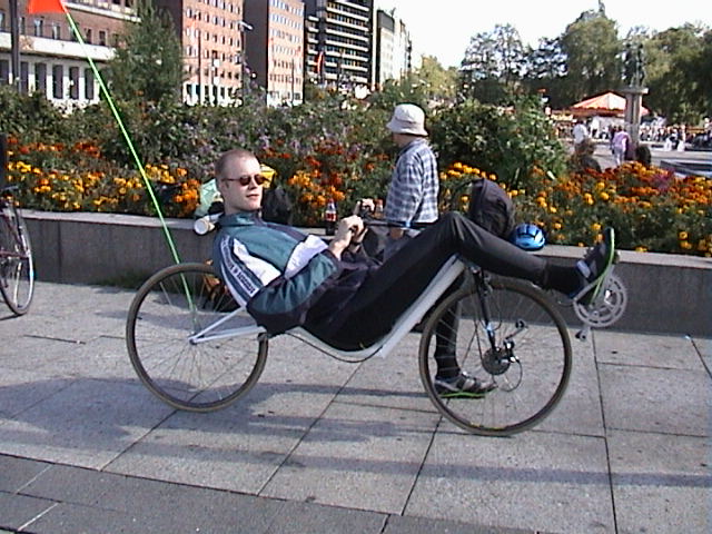 Nick Kram Seljeholtet 19B, 1344 Haslum 67531340(p) 22945089 (a) 91375861 (m) nick.kram_at_akermar.com Video(3,5 MB) Image | I've known about recumbent bikes for quite some years, but never did something about it.... until 1997 when I cycled through Denmark and saw a few people travelling on their bents. So during the next visit to Holland, my native country, I rented/tried out 3 different bikes and got even more excited. Since summer '98 I am the proud owner of an M5 Street Legal 28/20. The Street Legal is a short-wheelbase, underseat-steering recumbent, designed by the famous Bram Moens owner of M5, but the manufacturing was by Speedliner (now belly-up). My dream, however, is still to built a Flevobike Racer, maybe using alternative materials. But will I find time......??? |